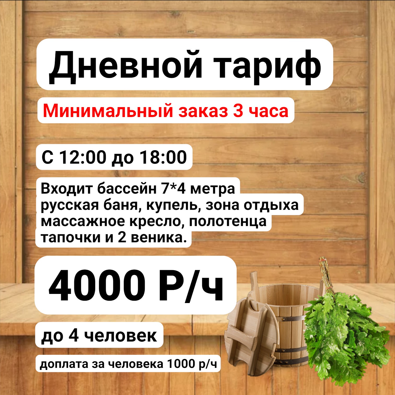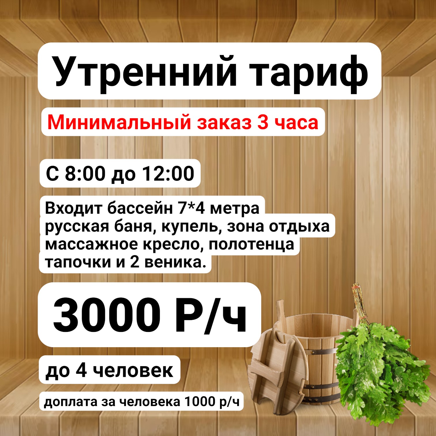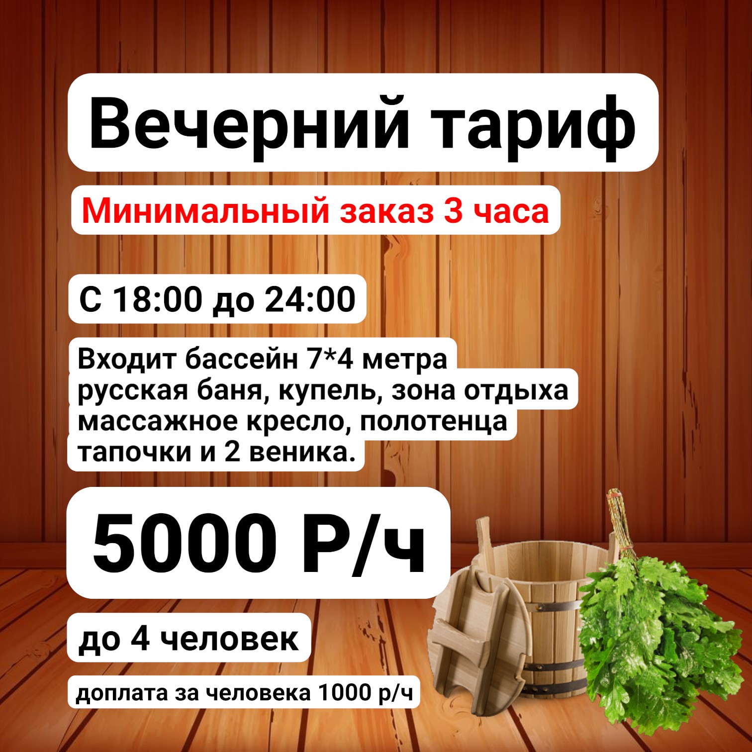 Бассейн 7 на 4 метра, ледяная купель, гидромассаж, массажное кресло и всё, что нужно для полноценного отдыха. Вы получаете полностью оборудованную площадку, где можно расслабиться, пообщаться и отпраздновать событие с максимальным комфортом.